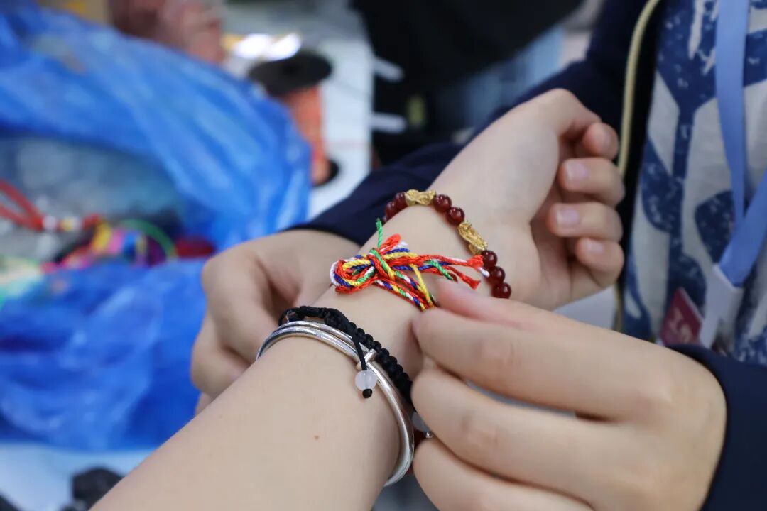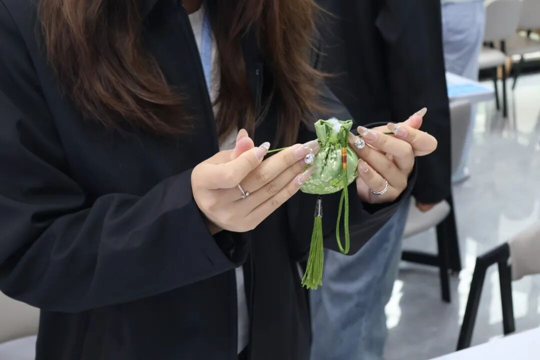 投壶游戏区域同样人气爆棚。作为经典的传统互动游戏,投壶吸引了众多同学一试身手。参与者只要表现出色,就能赢得制作端午节元素香包或五彩绳的机会。现场准备了布料、香料、针线、彩色丝线、珠子等丰富材料,还有老师全程指导。同学们在制作过程中,不仅掌握了传统手工艺品制作技能,还打造出了专属的端午纪念品。