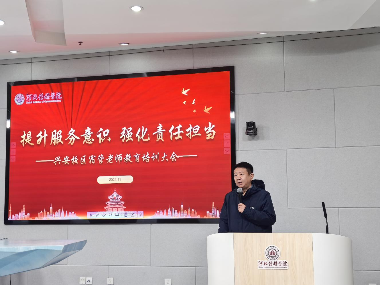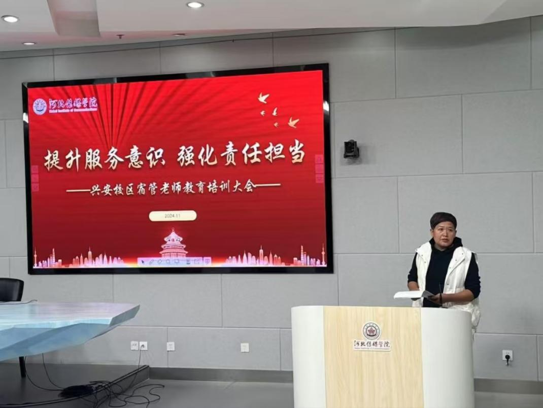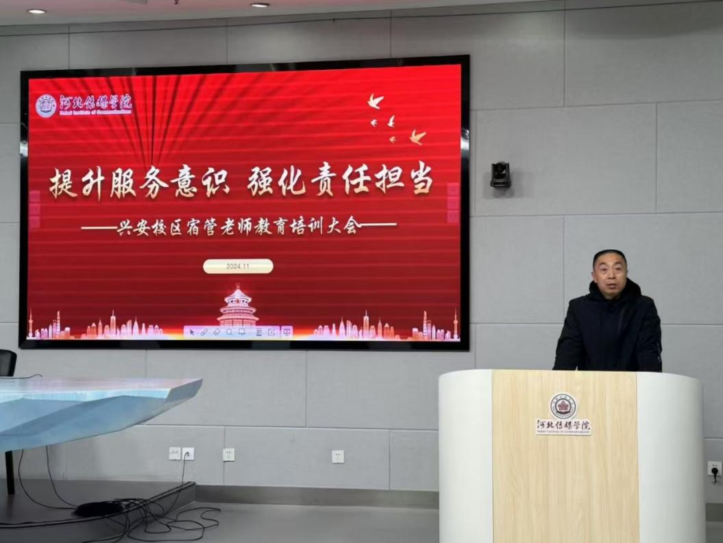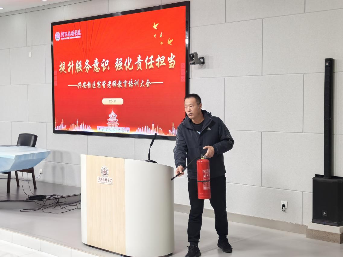 为扎实推进“严校风、强养成、抓学风、促提升”百日竞赛评比活动走深走实,在规范学生宿舍文明安全的同时,进一步提升生活老师的专业素养和工作能力,加强校园安全管理,兴安校区于 2024年11月4日 8:00 在兴安校区话筒楼小学术报告厅举行“提升服务意识,强化责任担当”兴安校区宿管老师教育培训大会。党委副书记副校长陈强、学生处处长刘军、安全工作处消防科科长陈广柱、学生处相关老师及兴安校区全体66位宿管老师参会。学生处副处长王书敏主持会议。