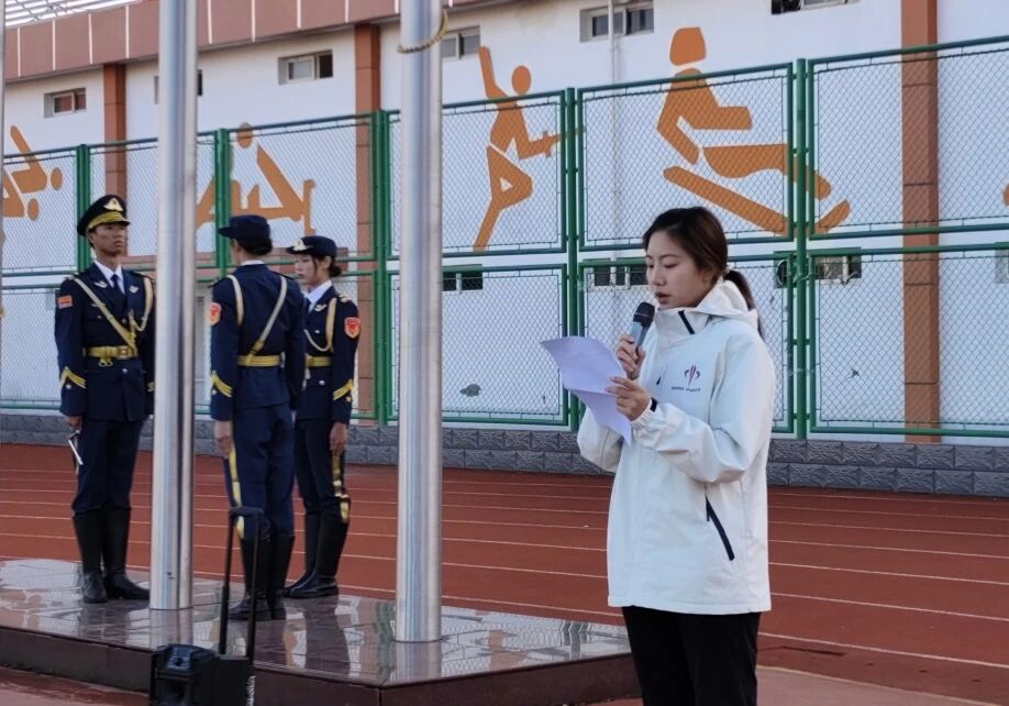 兴安校区24级影视艺术学院摄影6班学生代表王怡然在国旗下发言。发言主题为“传承红色基因,续写奋斗华章”。她通过列举李大钊、焦裕禄和黄文秀等榜样及其优秀事迹,指出传承红色基因可以从日常做起,呼吁同学们心怀红色信仰,在学习中拼搏,在成长中向上,让红色基因在新时代焕发光彩,让青春在奋斗中绽放光芒。