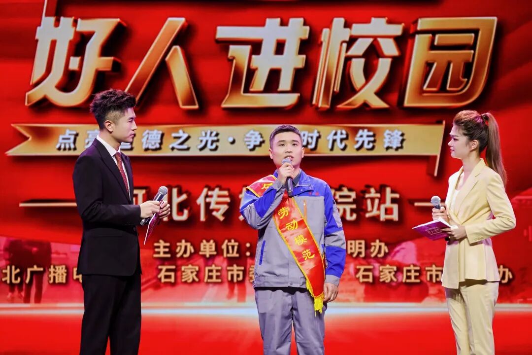 活动以我校学生表演的开场歌舞《身边》拉开帷幕。温暖的旋律、贴近生活的歌词,将“好人就在身边”的主题娓娓道来。随后,四位模范人物依次登台,用不同形式讲述各自的感人故事。国内珠峰“南北双登”最小年龄纪录保持者栾钰堃,通过事迹短片展现攀登历程后,现场分享了自己在极端环境中永不放弃的意志,鼓励学子“以攀登者的姿态突破人生每一道难关”;冀中装备集团石家庄煤矿机械有限责任公司毛料分厂焊接机器人班组长关虎的故事,先由我校学生以小品形式还原其工作场景,再由他本人讲述从普通工人到技术能手的转型之路,诠释“平凡岗位也能成就非凡价值”;久久爱志愿服务中心“爱心妈妈”信宝颖,先通过主持人现场电话连线被帮扶孩子传递温暖,再登台细数公益路上的坚守与担当,让现场温情满溢;新华区政府合作路街道办事处安全发展办公室孟令川,则以新闻视频还原车祸救人现场,随后再用亲身经历诠释责任与勇敢。每一位模范人物分享后,主持人都邀请现场学生提问交流,在“心灵对话”中让青年与榜样深度共鸣。
